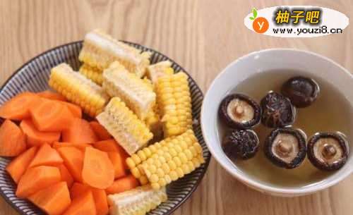 3把玉米、胡萝卜切成小块,香菇用温水泡发