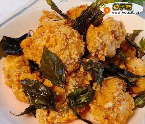 6撒上盐,拌入已炸的九层塔叶,盐酥鸡就完成了。