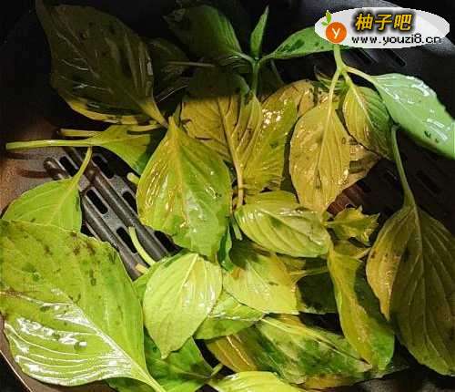 3预热气炸锅180度,放入九层塔叶。气炸约5分钟至出香味脆身,取出备用。