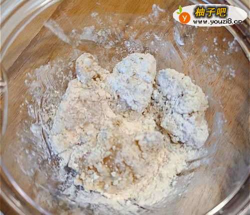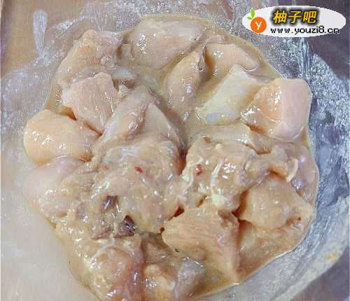 4鸡粒均匀沾上蕃薯粉,静置1-2分钟等反潮。