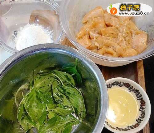 2摘取九层塔叶片,洗净抺干。放入盆中加入少许油拌匀。鸡柳肉上粉前先加入约一大匙的蕃薯粉抓匀。再将蛋白加入已腌的鸡柳肉拌匀。