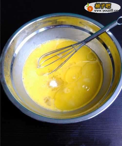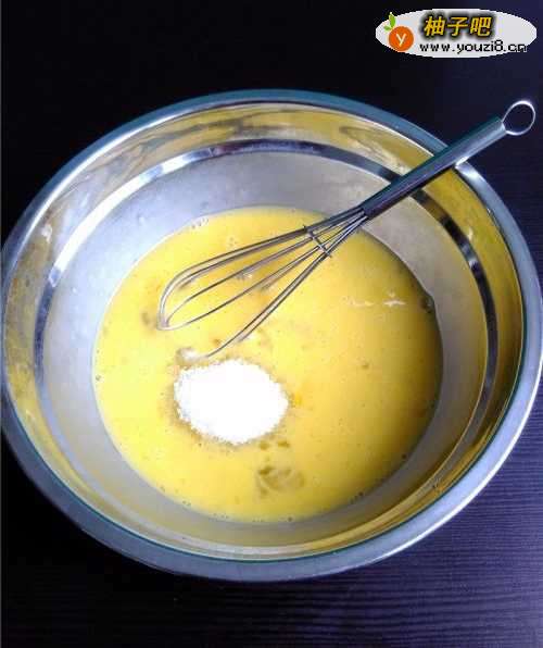 3用手动打蛋器将蛋液搅打均匀后,放入白糖。