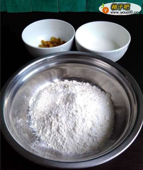 备好食材:低筋面粉、葡萄干、牛奶等其他食材。