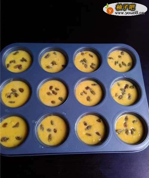 10将玛芬糊倒入烤盘,8分满即可,再撒入葡萄干。