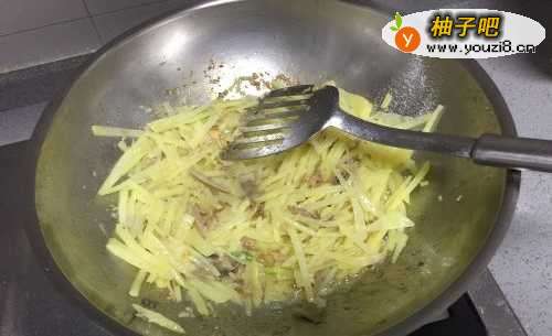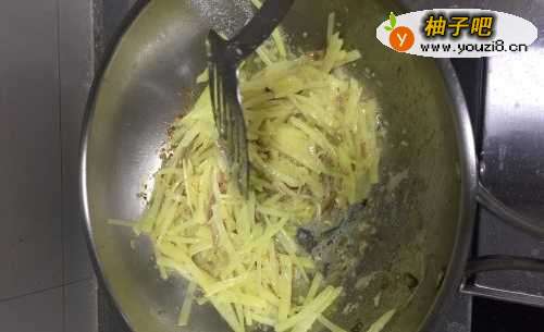 3热锅后倒入油,8成热,放入姜蒜爆香后倒入土豆丝