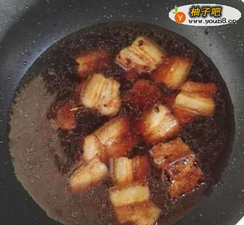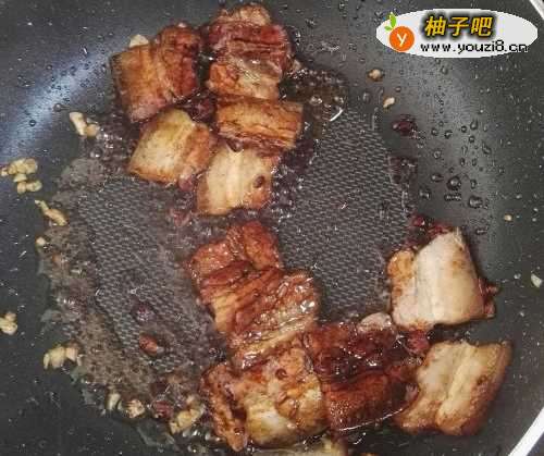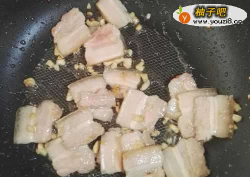 4锅中放油油热后放入蒜末煸香后倒入五花肉,煸出大油。