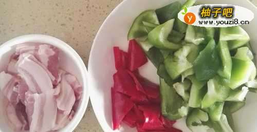 五花肉洗净切成大片,青红辣椒切碎备用。