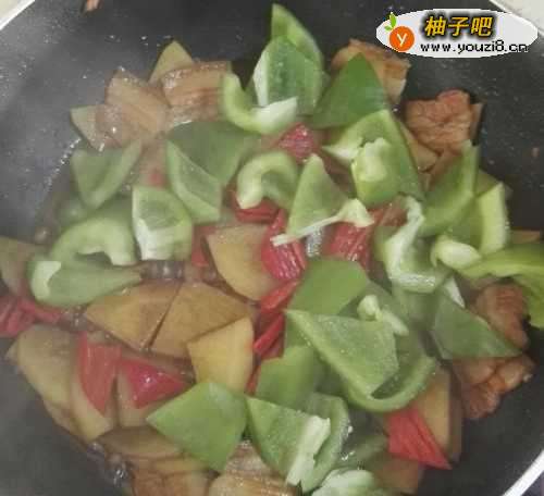 8最好放入青红辣椒,翻炒一下,大约两分钟关火盛盘。