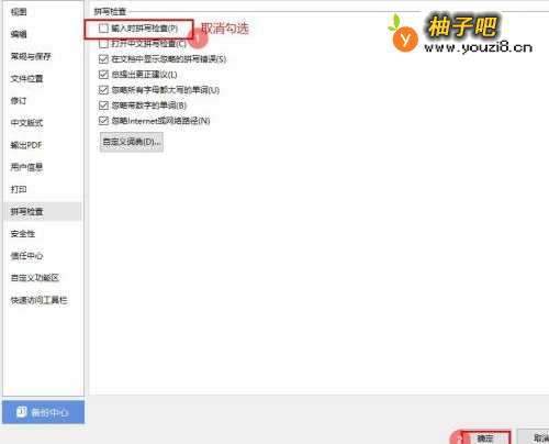 4在“拼写检查”对话列表中,取消勾选【输入时拼写检查】,然后点击【确定】即可;