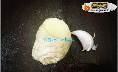 4准备少许生姜、蒜头,八角、滕椒等,生姜洗净切丝,蒜头去皮切末;打开电磁炉,加入适量油,先将猪头肉放入稍微炸一会。