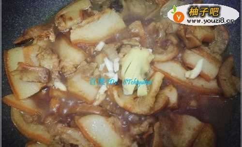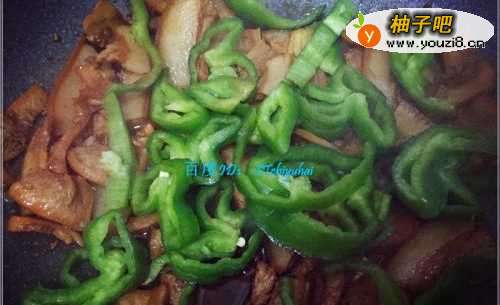 6一会加入前面切好的泡椒、姜蒜以及红烧酱油,然后翻炒一阵。