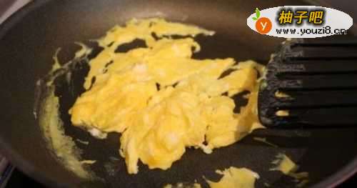 先把鸡蛋打散后,先把蛋炒到嫩嫩的先呈到盘子中。