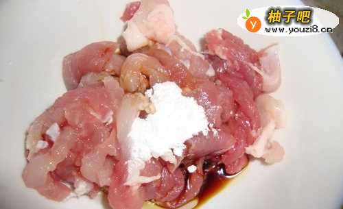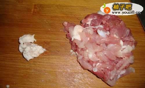 2瘦肉放入碗里,加淀粉,油,生抽,搅拌好腌制。肥肉放在一旁。