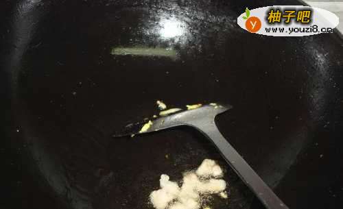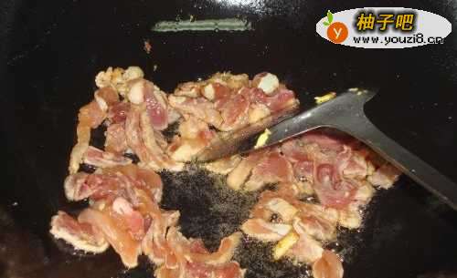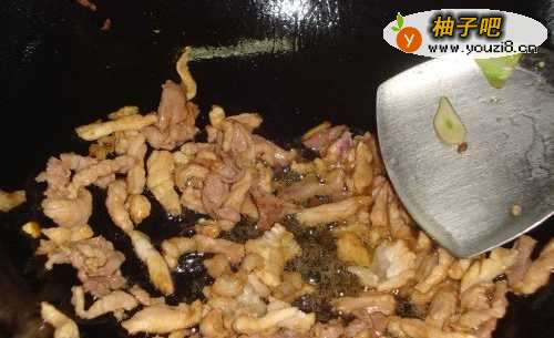 6瘦肉入锅后要不停搅拌,表面变色后倒入蒜黄。