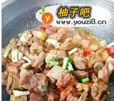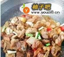 7下八角煸出香味,下排骨翻炒均匀,加米椒,加适量的水,小火焖煮40分钟至熟,大火收干汤汁后,加大蒜梗翻炒均匀