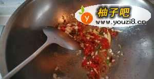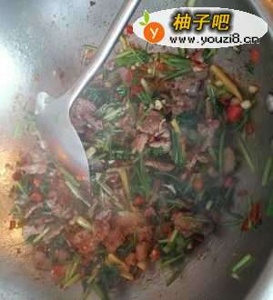 4为了省油,我是用炒牛肉的油继续炒,没洗锅。加辣椒碎,蒜末,姜丝炒出香味。