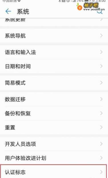 5向下滑动系统页面,找到“认证标志”并点击;