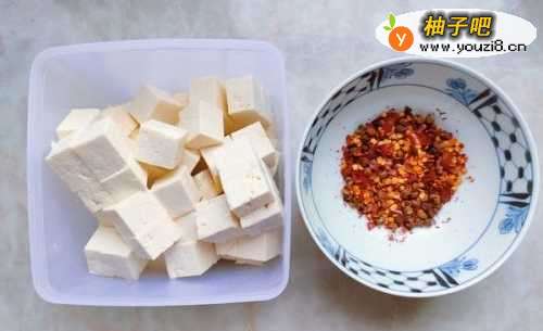 将豆腐切成1厘米见方的小块。干辣椒和花椒混合碾碎。