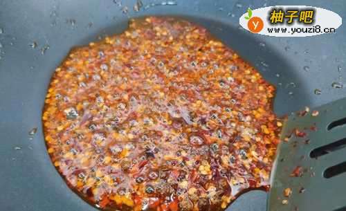 3锅中倒少许油,将干辣椒碎和花椒碎倒入,小火煸出香味,盛出备用。