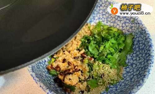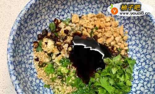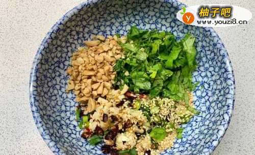3将蒜末、葱末、花生、芝麻、香菜、干辣椒、辣椒放入碗中备用