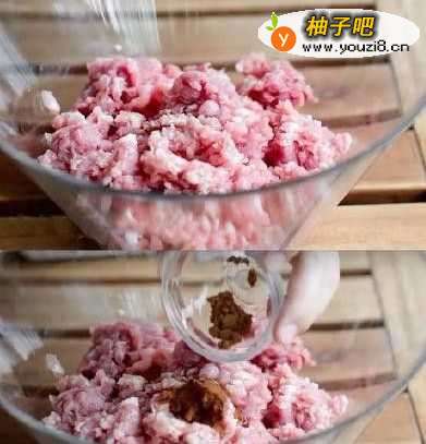猪肉洗净剁碎,要非常非常碎,如果你有绞肉机,那最好,没有的话,使劲剁。一定不要有颗粒,要碎成泥,一定要记住,碎成泥。
