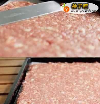 4烤盘准备,铺上烹调纸(烤箱纸,不是锡纸),然后把肉均匀的扑在纸上,这里可以用蛋糕刀铺平,你也可以再盖一层纸,用擀面杖擀平。厚度尽量控制的薄一些。