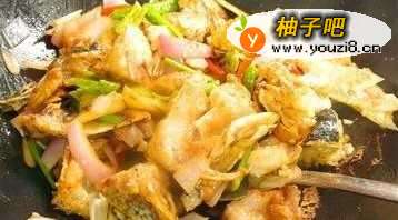 7放入炸好的鱼头,快速炒匀,调入盐、料酒、酱油、胡椒粉。