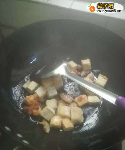 3炸出油后放入事先切好的豆腐块,煎至两面金黄,捞出备用