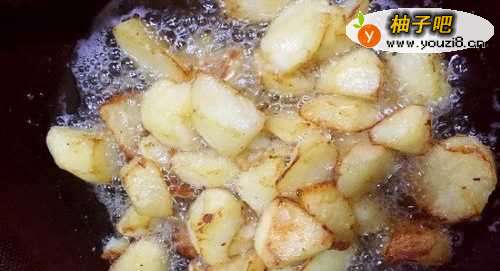 3炒锅洗净烘干,倒入适量花生油预热,待油热后,土豆即可沥干入锅。油量最少要没过土豆块二分之一,最好能全没过土豆块。将土豆炸至金黄,便可捞起备用。