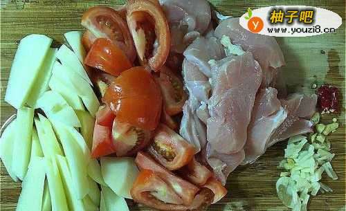 鸡胸切片、土豆和番茄切块、蒜头和辣椒切碎。
