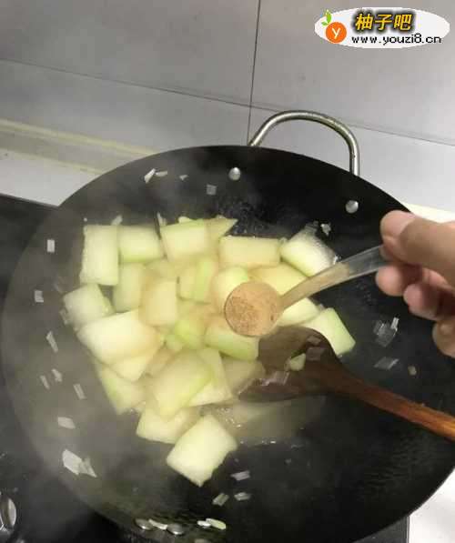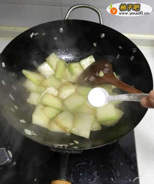 5冬瓜炒到8分熟的时候放入1勺盐。
