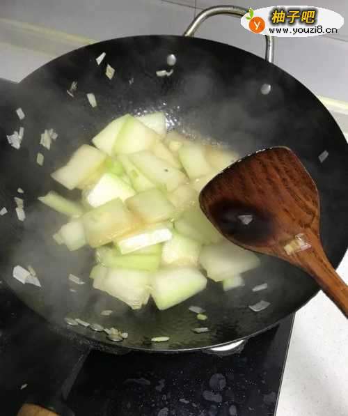 4放入冬瓜翻炒2分钟,然后再接着放入2小勺耗油和1小勺生抽。
