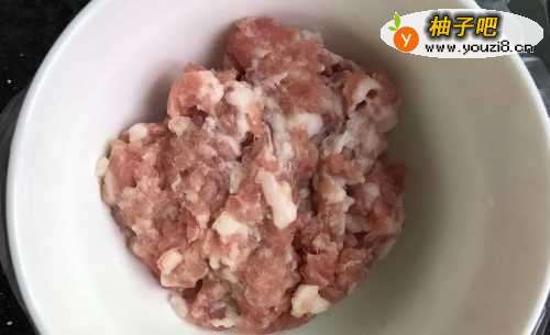 2准备半碗猪肉碎,放油,盐,淀粉腌15分钟左右。怎么腌猪肉好吃,参考前面的经验哦。蒜米拍碎待用。