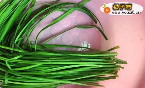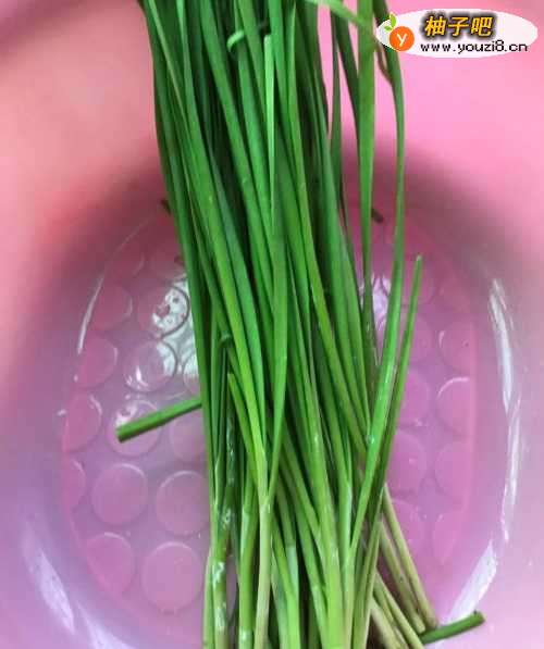 韭菜切去头一小部分。韭菜头有点老,不老的话就用切。然后洗多几次,洗干净。