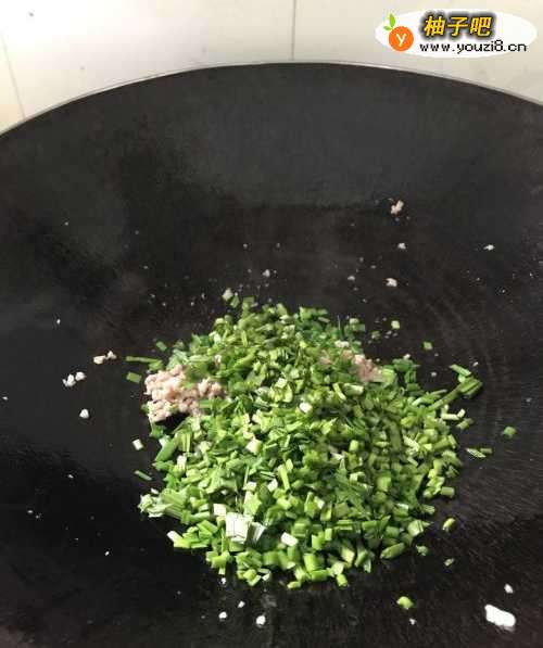 5然后把韭菜放入,继续翻炒。跟猪肉碎翻炒均匀。加入酱油调味。韭菜很容易就熟了。翻炒至韭菜变软,就差不多可以了。
