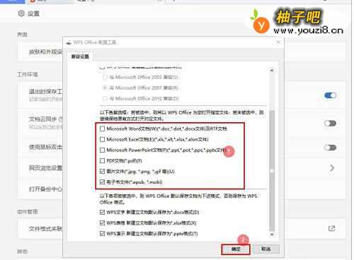 4在“WPS Office配置工具”窗口,勾选【文档文件关联格式】,然后点击【确定】即可。
