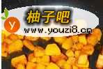 2不粘锅加油烧热,入南瓜丁小火煎至表面微焦