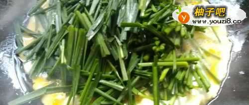 4油热后,倒入打散的鸡蛋,略成型后加入韭菜段,翻炒至熟。