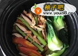 5起盖后加入香葱,铺上青绿油菜(如果是黄鳝、田鸡时间可短一些,若是牛肉还要再长一点)要注意的是饭菜要兼顾(控制好火候)