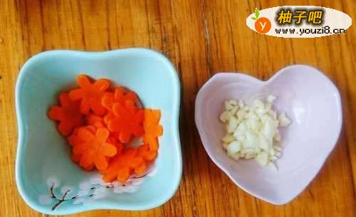 3:胡萝卜切花或菱形片,蒜瓣剁碎备用。