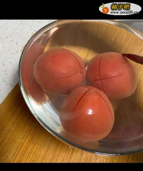 4三个番茄划十字,倒入开水烫一分钟,去皮。