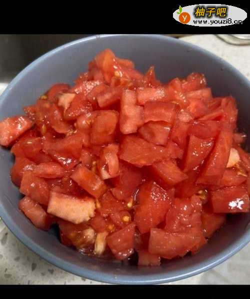 5将番茄切成小丁放置一旁备用。+