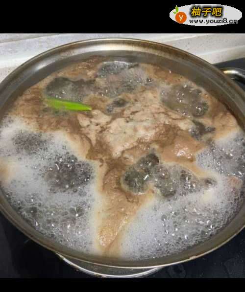 2牛腩冷水下锅,加入一把小葱和几片姜,煮开,煮出血沫。