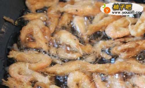4待油热,把小虾放入锅中炸至金黄,切忌不要炸过,会糊