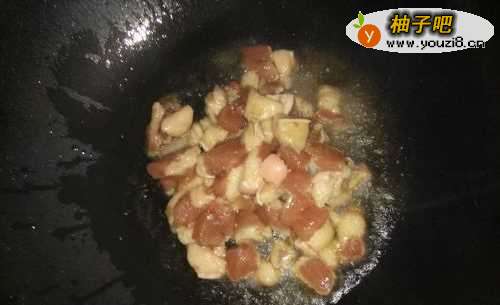 2将五花肉洗干净,切成小块,下入锅里,煎一下;煎到出油为止;
