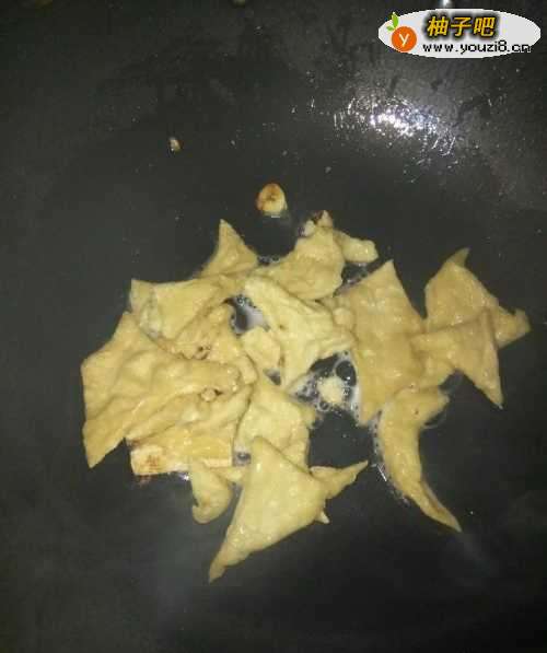5待锅里的蒜头炒香之后,将油豆腐下入锅里,加入适量的水,煮熟;