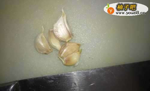 4取4个蒜头,用刀压一下,将膜去掉,清洗干净;开火,将蒜头下入锅里;