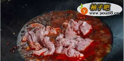 5现在添加豆瓣酱,炒3 - 4分钟。这将给水煮肉片增加鲜红的颜色,一定要控制火候,过低,不会有鲜亮的红色;太高,调料会焦。加入水和糖,直到煮沸后加入牛肉。煮2分钟后迅速关掉火,保持肉的滑嫩。
