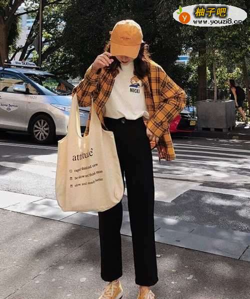搭配一:白色T恤+黄色格子衬衫+黑色小皮衣这套搭配发挥了很典型的叠穿技巧,白色T恤作为内搭,搭配一件黄色格子衬衫和黑色小皮衣,下身搭配一条黑色休闲裤,时髦感十足。