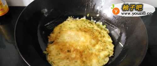 4锅中倒入适量油(可以多放点),待油烧热,将鸡蛋液倒入锅中,中小火煎制